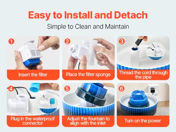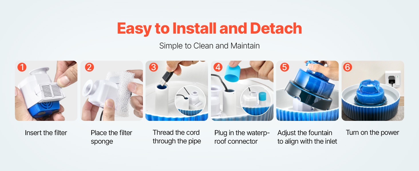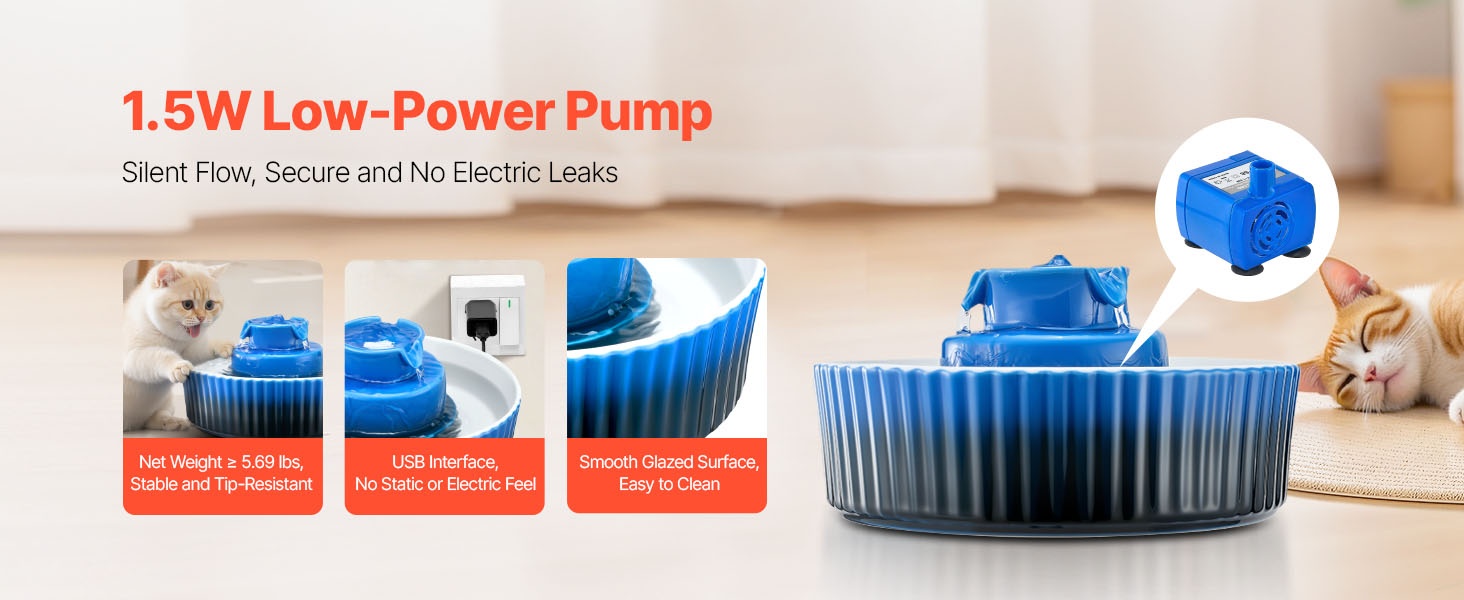 Matalaenergiainen 1.5W pumppu toimii hiljaisesti, joten allas sopii myös makuuhuoneeseen tai muihin hiljaisiin tiloihin. Vakaa ja kaatumista ehkäisevä rakenne, staattisuusvapaa ja sileä lasitettu pinta tarjoavat lemmikille rauhallisen ja turvallisen juomahetken.
