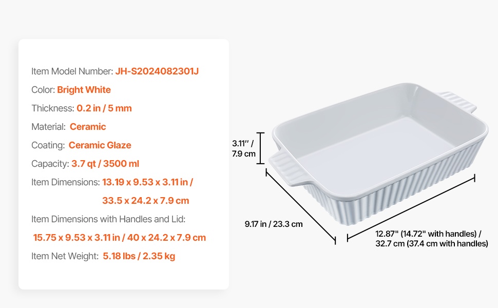 Keraaminen suorakulmainen uunivuoka 3,5 l kaksikahvainen valkoinen kiiltävä lasitus