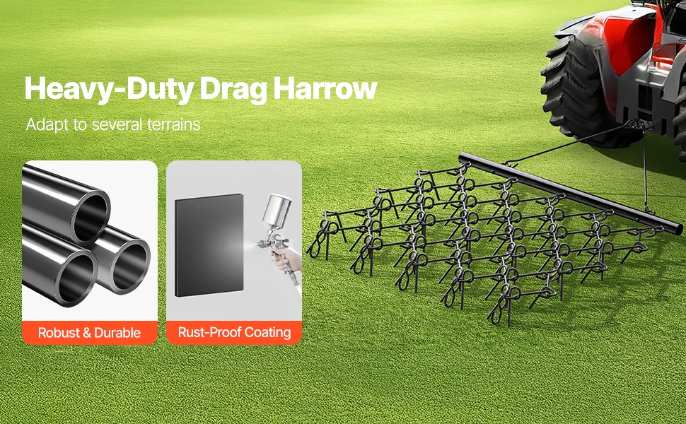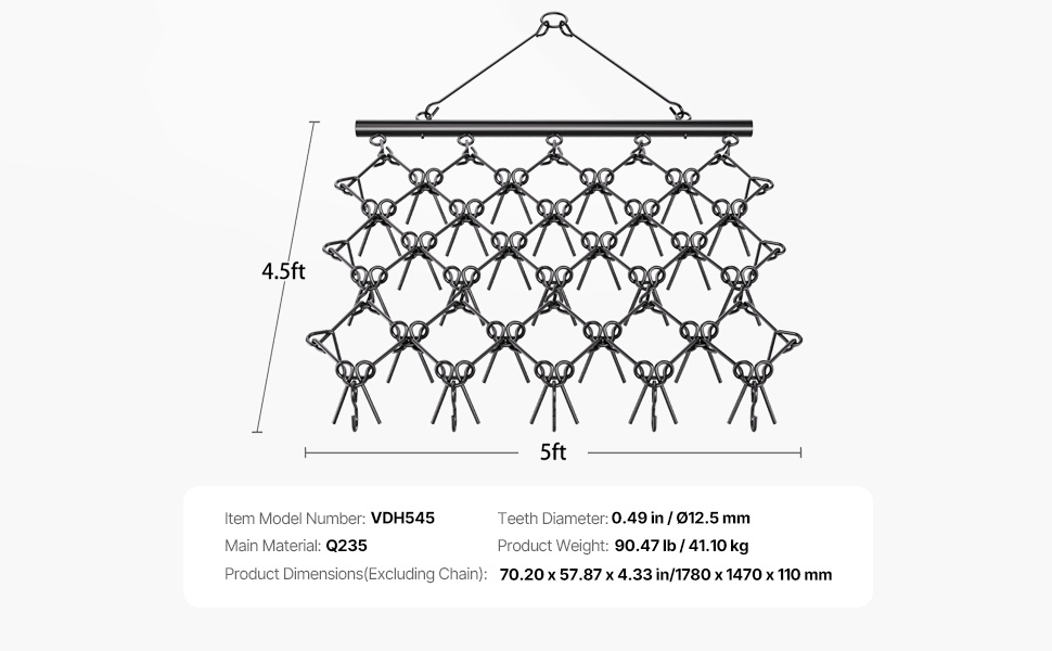 Raskasvetoinen kettoaura helpottaa maan tasoittamista ja pihanhoitoa. Korroosionkestävästä Q235-teräksestä valmistetussa aurassa on yhteensä 60 hammasta, jotka pureutuvat maahan tehokkaasti. Suuri koko (5 x 4.5 jalkaa) nopeuttaa työskentelyä, ja yleismallinen vetosilmukka tekee kiinnittämisestä vaivatonta. Sopii hyvin pelloille, pihoille, urheilukentille ja sorapihoille.