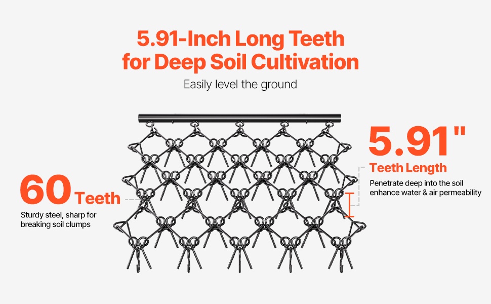 60 vankkaa hammasta, joista jokainen on 5.9 tuumaa pitkä, tunkeutuvat helposti maahan, rikkovat kovettunutta pintaa ja parantavat maan ilmavuutta ja veden läpäisyä. Tämä edistää maan terveempää rakennetta ja tasaisempaa kasvualustaa esimerkiksi kylvöä ja nurmikonhoitoa varten.