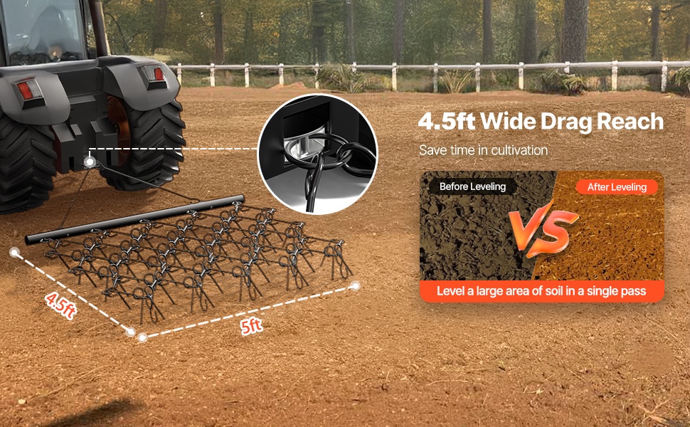 Kettoaura on valmistettu kestävästä, korroosiota vastustavasta Q235-teräksestä. 60 hammasta mahdollistavat syvän maanmuokkauksen, ja 5 x 4.5 jalan koko kattaa kerralla laajan alueen. Yleinen vetosilmukka helpottaa kytkemistä eri vetolaitteisiin, mikä tekee laitteesta monikäyttöisen ratkaisun pelloille, pihoille, urheilukentille ja piha- sekä sorateiden kunnossapitoon.