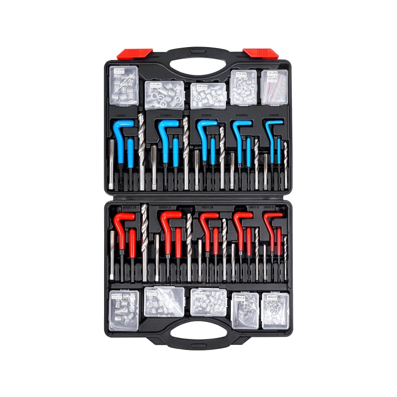 Tämä kierrekorjaussarja on monipuolinen kokonaisratkaisu eri kokoisten vaurioituneiden tai kuluneiden sisäkierteiden korjaamiseen. Sarja on käytännöllinen ja helposti mukana kulkeva, ja se on suunniteltu kestämään toistuvaa käyttöä. Se helpottaa huoltotöitä ja parantaa työn tehokkuutta niin ammattilaisilla kuin harrastajillakin.