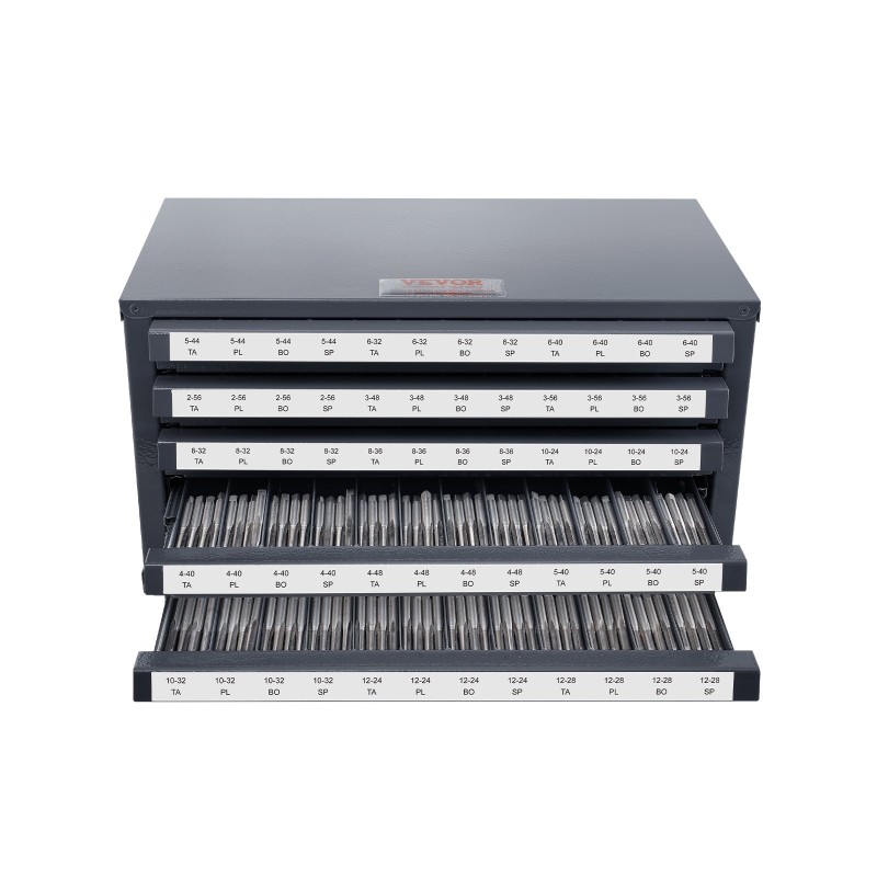 Tässä viisitlaatikkoinen kierteitystappikaappi, jossa on yhteensä 60 lokeroa tapille kokoluokassa #2-56–#12-28. Jokaisessa lokerossa voidaan säilyttää yksi kierretytappi tai muita pieniä tarvikkeita. Selkeästi jaetut lokerot pitävät eri kokoiset ja tyyppiset tapit omilla paikoillaan.