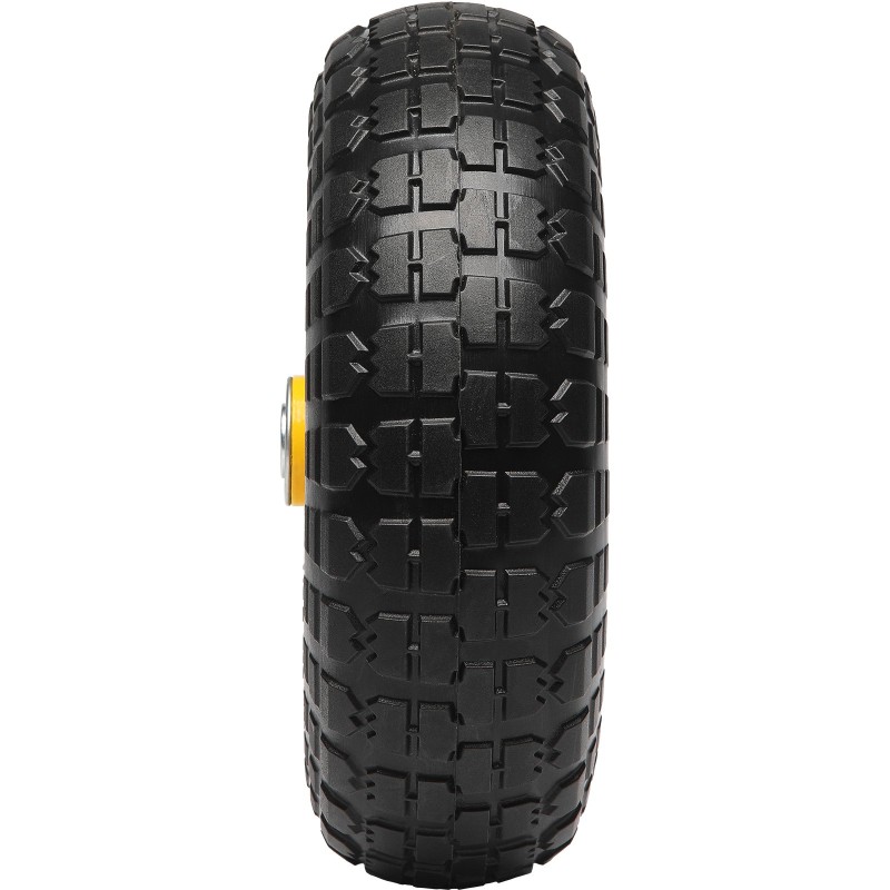 Kiinteät PU-pyörät on varustettu 3.2" / 81 mm leveällä kulutuspinnalla ja sahalaitakuvioinnilla. Rakenne parantaa pitoa nurmikolla, soralla, lumella ja muilla liukkailla alustoilla, mikä helpottaa laitteen hallintaa.