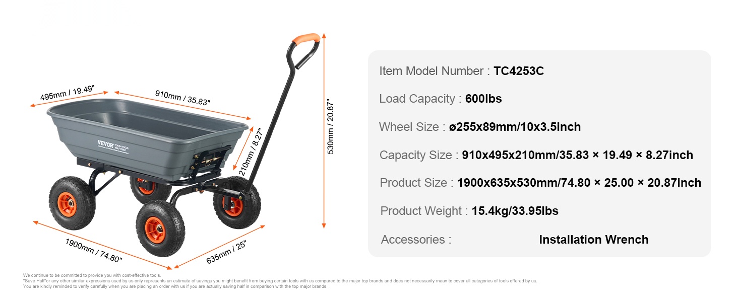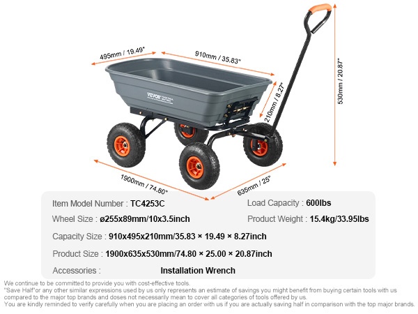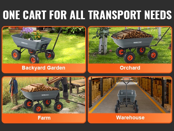 Tämä kippikärry helpottaa raskaiden kuormien siirtämistä pihalla, puutarhassa ja työmaalla. Vahva 1.2" paksu metallirunko ja kestävä lava mahdollistavat jopa 1500 lbs / 680.4 kg kuorman kuljetuksen. Suuri tilavuus tekee maa-ainesten, puutarhajätteen, polttopuiden ja muiden materiaalien siirtämisestä sujuvaa.