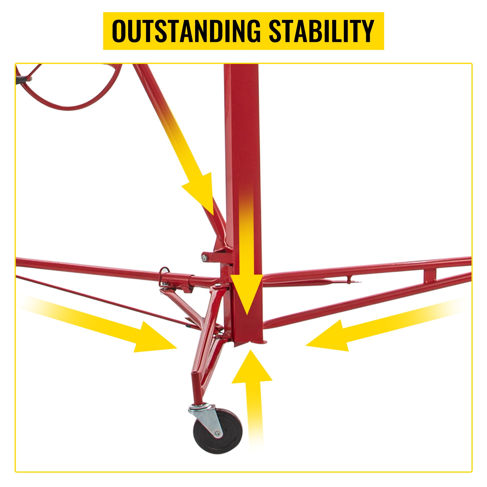 Kolmijalkainen jalusta jakaa kuorman tasaisesti ja pitää nostimen vakaana myös suurten levyjen kanssa. Sisäänrakennettu jarru lisää turvallisuutta lukitsemalla mekanismin paikoilleen noston aikana.