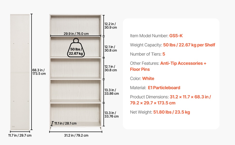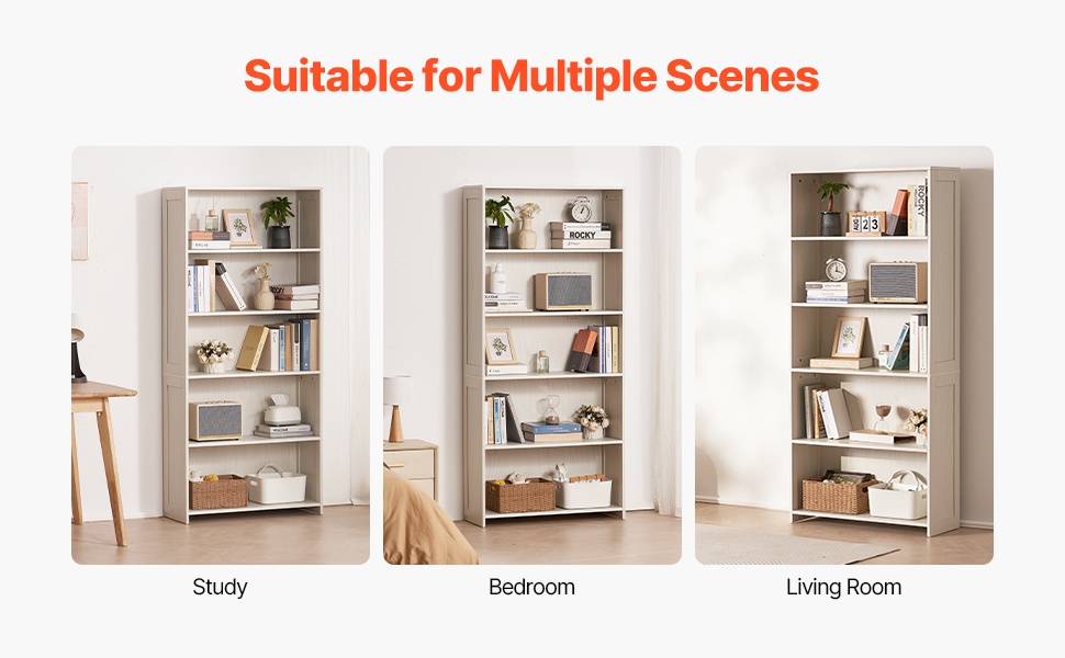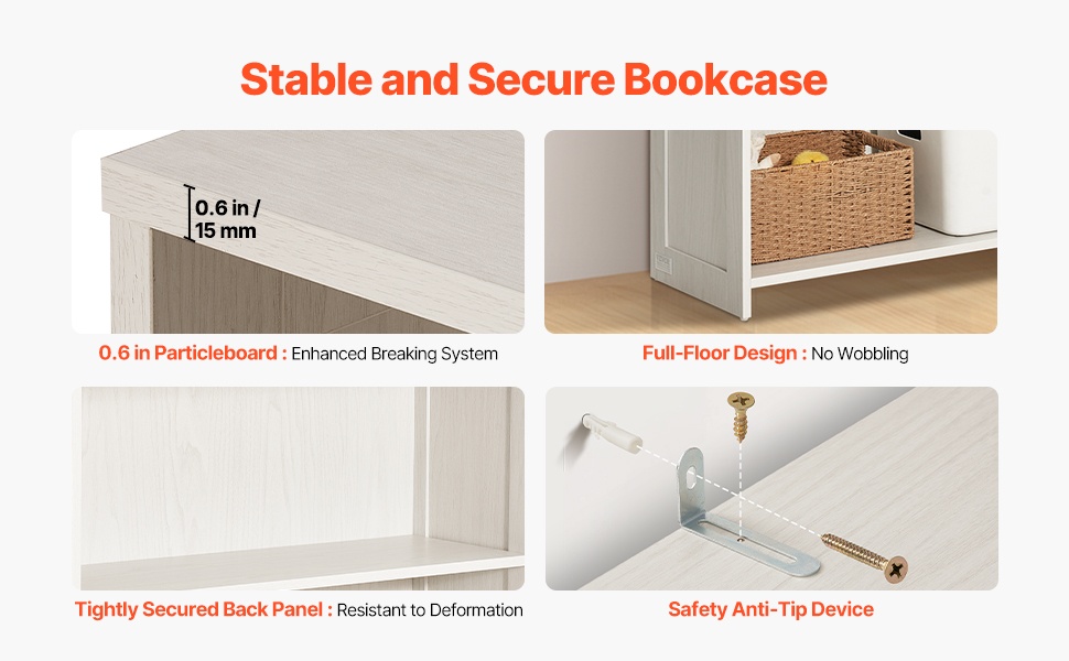 Leveä 5-tasoinen kirjahylly valkoinen E1-lastulevy kaatumisen estovarusteilla