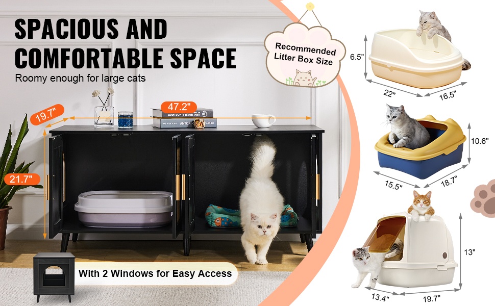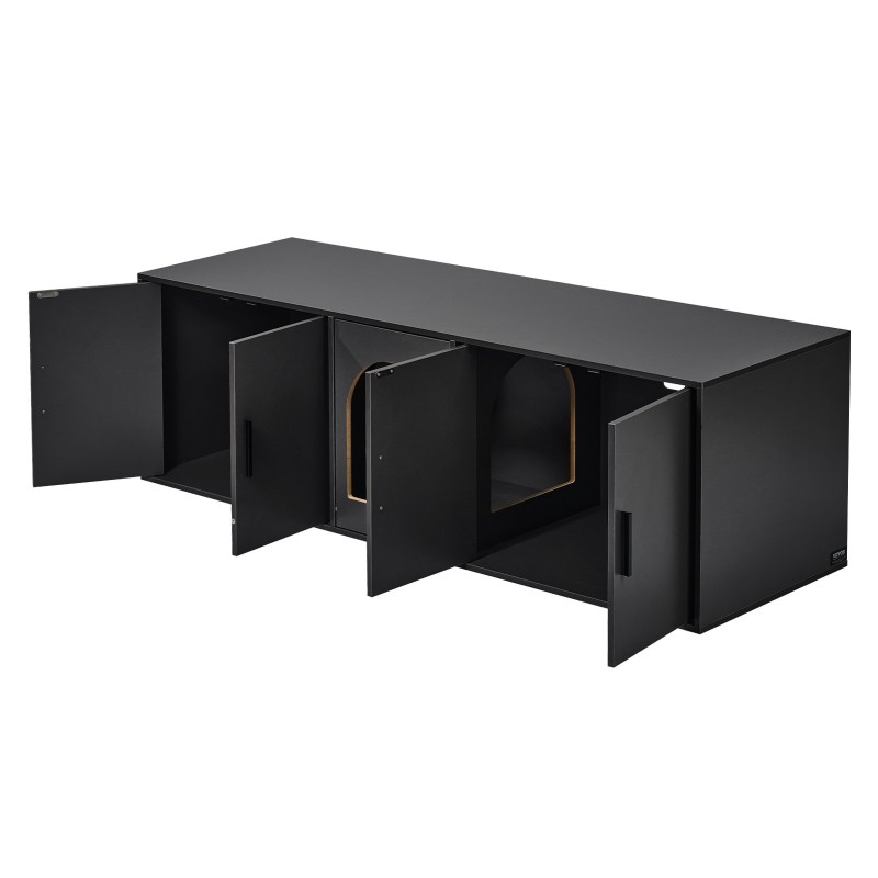 Tilava kaksihuoneinen rakenne ja 3 sisäänkäyntiä antavat kissoille helpon kulun ja oman rauhallisen yksityistilan. Useimmat koirat eivät mahdu sisään, joten kissasi voivat käyttää hiekkalaatikkoa rauhassa. Suuri koko sopii useimmille tavanomaisille hiekkalaatikoille ja tarjoaa hyvin liikkumatilaa.