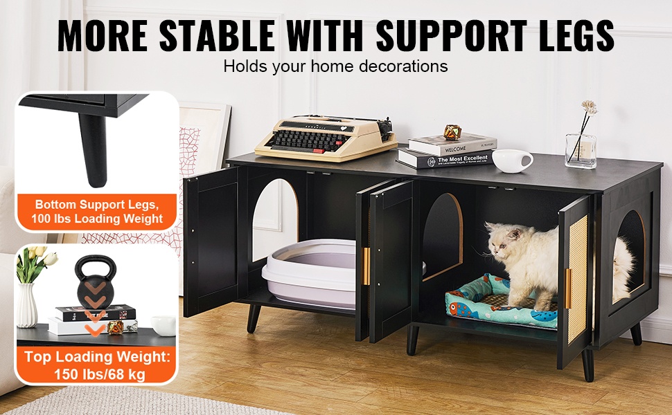 Piilotetun hiekkalaatikon lisäksi kaappi toimii pienenä kissatalona ja mukavana lepopaikkana. Selkeälinjaisen ulkoasun ansiosta sitä voi käyttää myös sohvapöytänä, TV-tasona tai sivupöytänä olohuoneessa, parvekkeella tai muussa sisätilassa.
