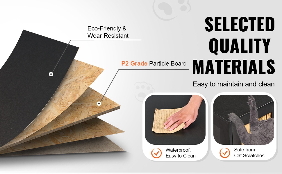 P2-luokan lastulevystä valmistettu kaappi on suunniteltu kestämään päivittäistä käyttöä. Laadukas, vedenpitävä pinta ei vahingoitu helposti kissan kynsistä, ja mahdolliset virtsaroiskeet tai muut tahrat on helppo pyyhkiä puhtaaksi, mikä helpottaa päivittäistä siivousta.
