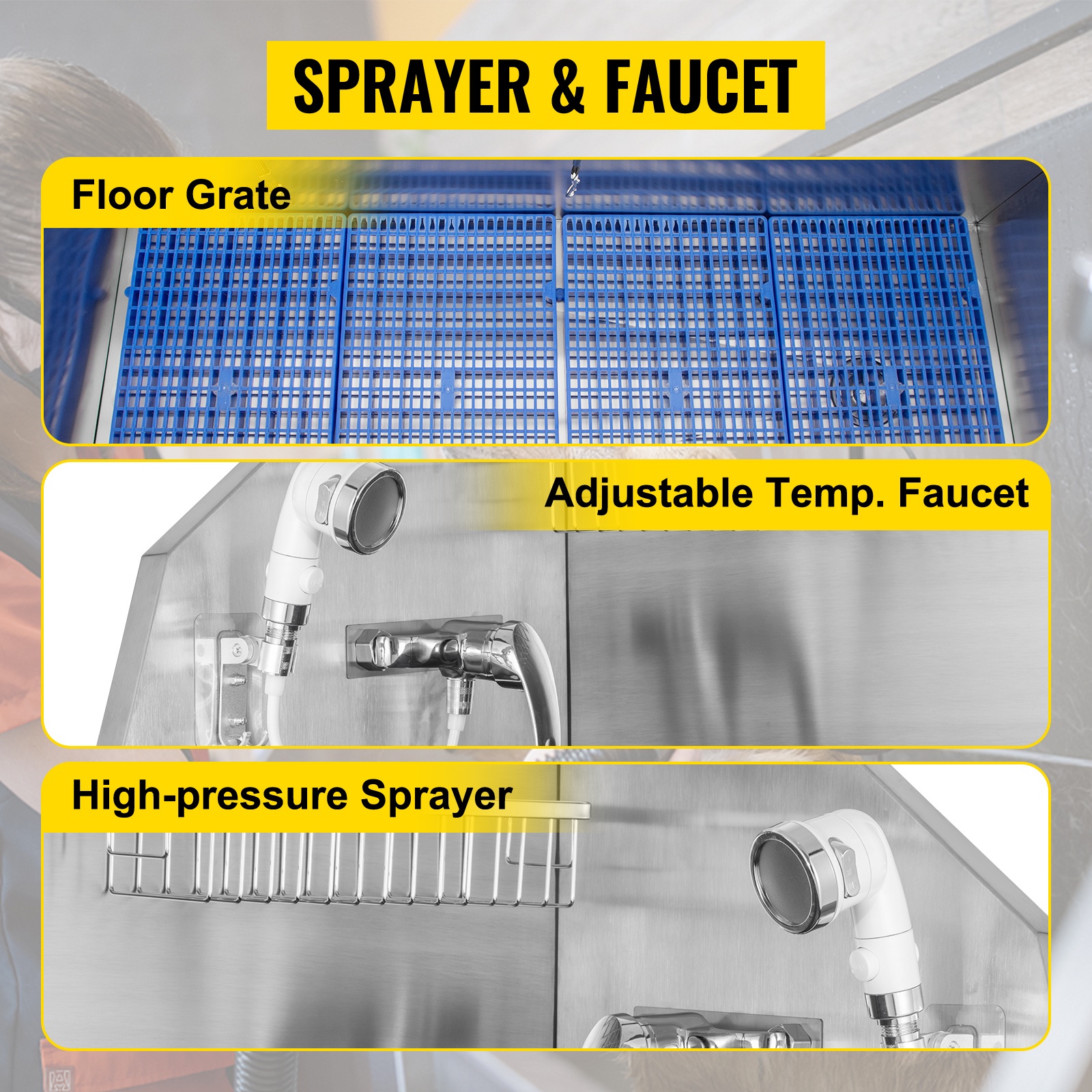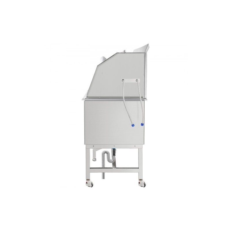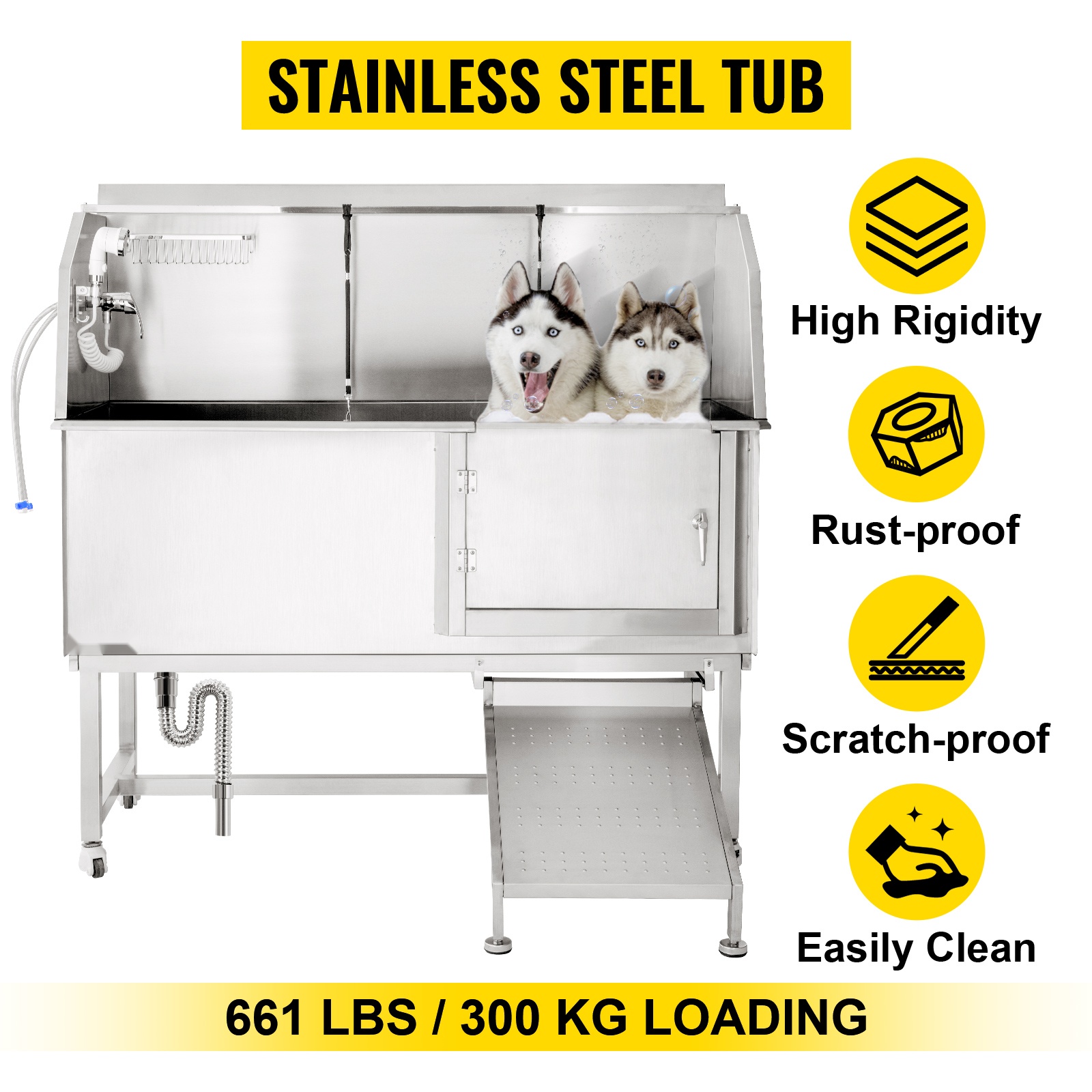 Tämä lemmikeille tarkoitettu pesuallas helpottaa koirien ja muiden lemmikkien pesua kotona, eläinlääkäriasemalla tai trimmaamossa. 304-ruostumattomasta teräksestä valmistettu rakenne on kestävä ja helppo pitää puhtaana. Altaassa on liukuovi, ramppi, säädettävä suihku, hana sekä viemäröintisarja, jotka tekevät pesuhetkestä sujuvan sekä lemmikille että omistajalle.