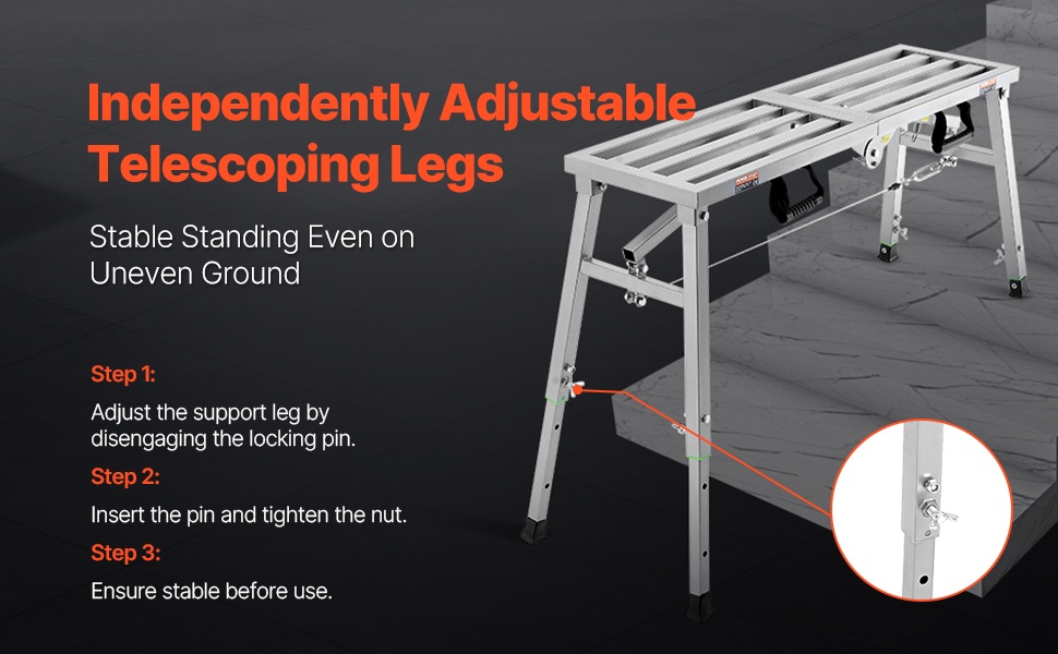 Yksittäin säädettävien teleskooppijalkojen ansiosta alustan korkeutta on helppo muokata työtilanteen mukaan, myös epätasaisella lattialla tai pihalla. Tämä helpottaa turvallisen ja tukevan asennon löytämistä joka kerta.