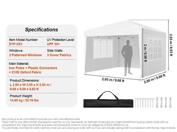 Noin 10 x 20 ft / L 5.9 x W 2.96 x H 2.65 m katos tarjoaa runsaasti tilaa pöydille, tuoleille ja muille varusteille. Se sopii lepohetkiin, ruokailuun ja yhdessäoloon ulkona.