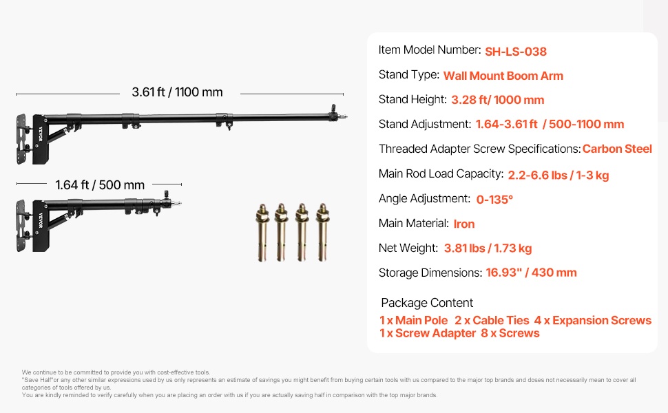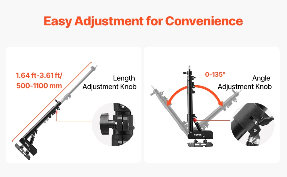 Tämä valaisinjalusta on varustettu universaalilla kierreadapterilla, jossa on 1/4 in ja 3/8 in ruuvi. Se tukee suurinta osaa kuvauslaitteista. Keskiputken enimmäiskuorma on 6.61–11.02 lbs / 3–5 kg ja puomivarren enimmäiskuorma 2.2 lbs / 1 kg. Korkeus on säädettävissä välillä 3.74–13.12 ft / 1140–4000 mm, ja puomivarren kulma on säädettävissä 180°, joten jalusta kattaa monenlaiset kuvaustarpeet.