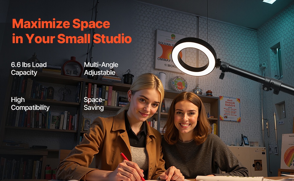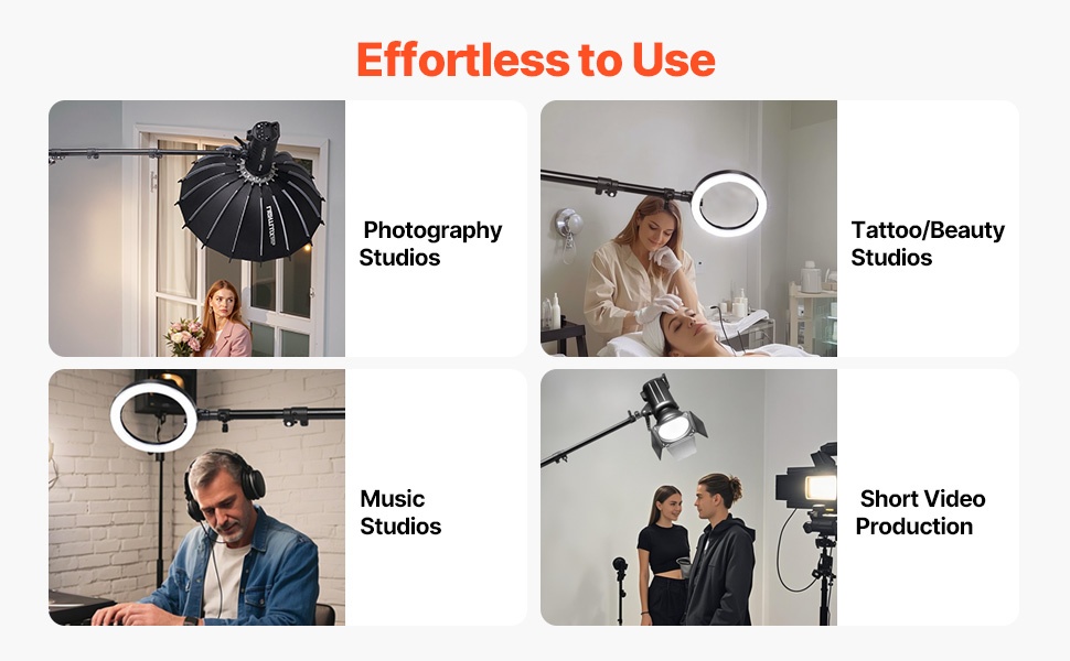 180° säädettävä puomivarsi mahdollistaa kulman nopean ja helpon muuttamisen, jolloin saat vaivattomasti erilaisia kuvakulmia ja säädettyä valaisua. Ilmatyynyvaimennettu alumiinivalaisinjalusta helpottaa työnkulkua, säästää aikaa ja parantaa tehokkuutta kuvauksissa.