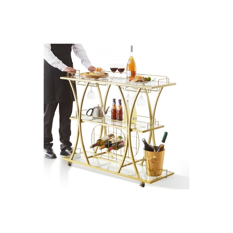 Kolmitasoinen kullanvärinen baarikärry, jossa on karkaistusta lasista valmistetut hyllyt ja metallinen suojakaide. Kätevä pulloteline ja integroidut viinitelineet auttavat pitämään pullot tukevasti paikallaan. Lukittavat pyörät mahdollistavat sujuvan siirtämisen huoneesta toiseen ja varman paikallaan pysymisen käytön aikana. Sopii olohuoneeseen, ruokailutilaan, keittiöön tai kotibaariin.