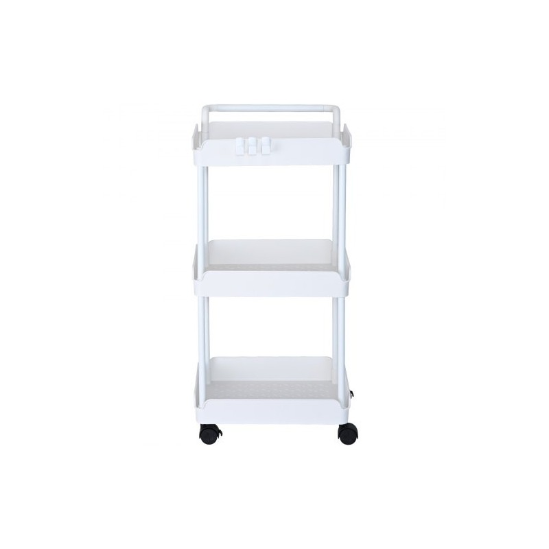Kolmitasoinen rullattava säilytyskärry PP-muovinen valkoinen enimmäiskantavuus 45 kg lukittavat pyörät