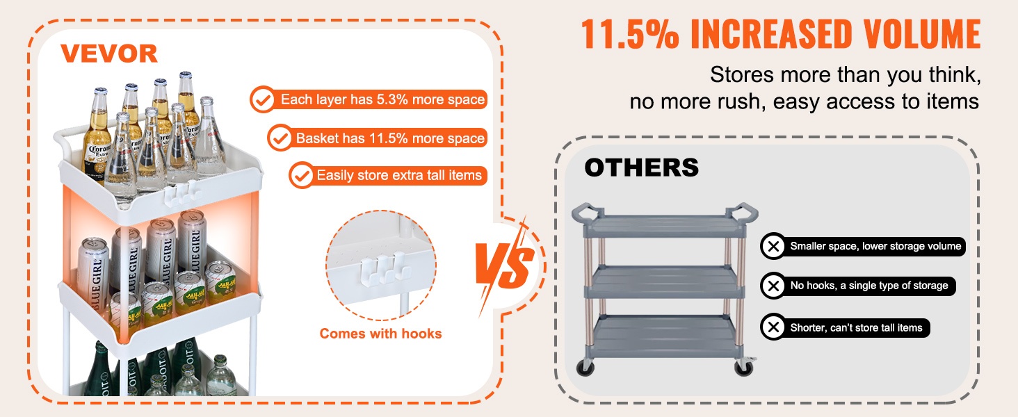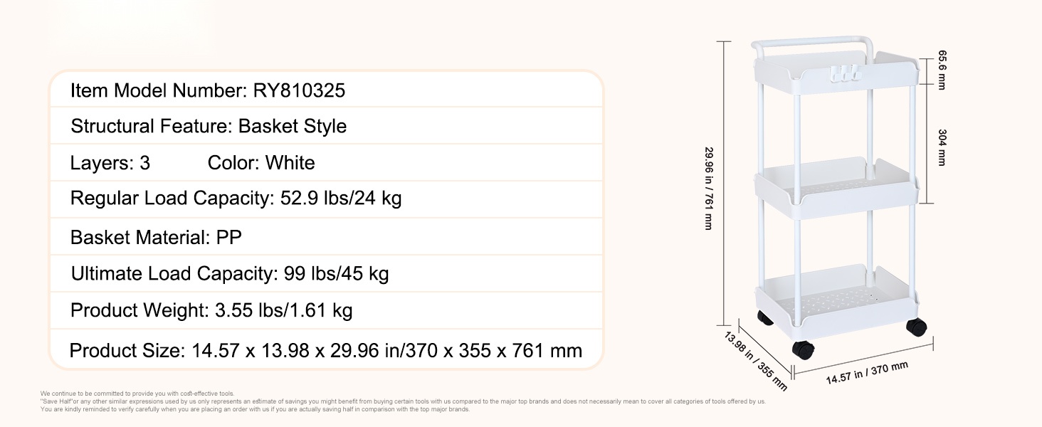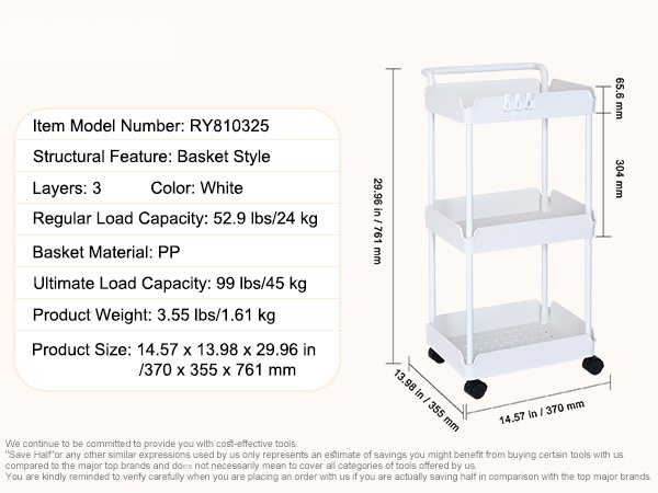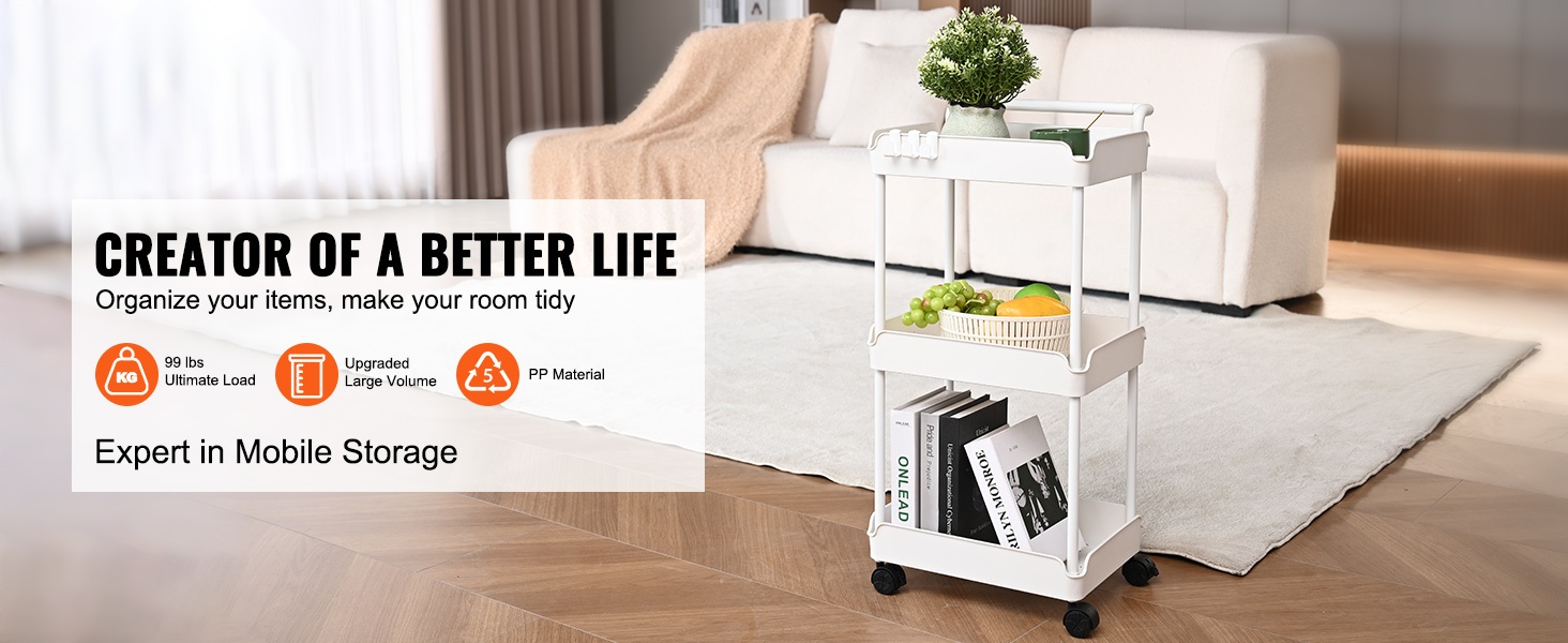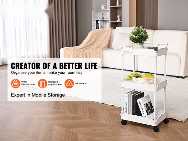 Tämä apukärry on suunniteltu kestämään jopa 99 lbs / 45 kg, joten se sopii useimpien arkitavaroiden säilytykseen. Korkealujuuksinen PP-materiaali varmistaa vakauden ja pitkän käyttöiän.