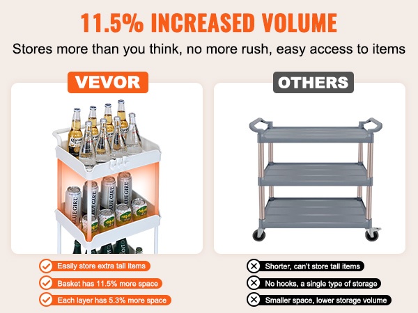 Säilytyskapasiteetti on noin 11.5 % suurempi verrattuna perinteisiin kärryihin. Kolme korimallista tasoa auttavat käyttämään pystysuoraa tilaa tehokkaasti, jotta tavarat löytyvät nopeasti ja pysyvät järjestyksessä.