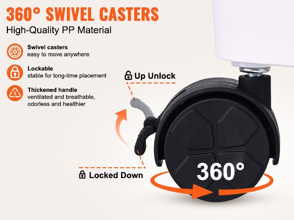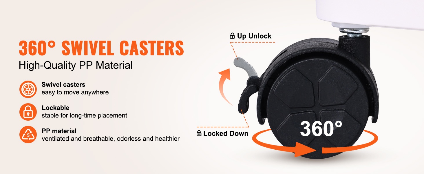 Säilytyskärryssä on 360 astetta kääntyvät yleispyörät, joiden ansiosta sen siirtäminen huoneesta toiseen on helppoa. Lukittavat pyörät pitävät kärryn tukevasti paikoillaan, kun se on asetettu oikealle paikalleen.