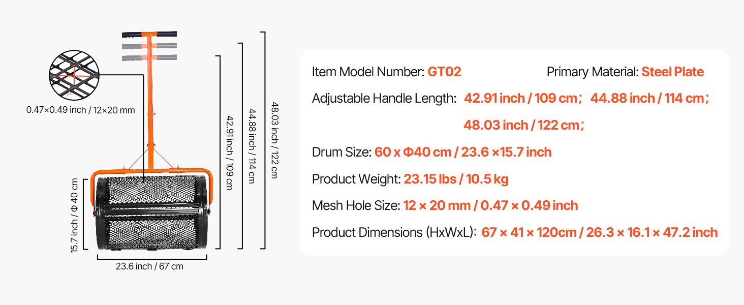 - Suurikokoinen rumpu eri materiaaleille, kuten komposti, turve, siemenet, lannoite, kalkki, multaa ja hiekka