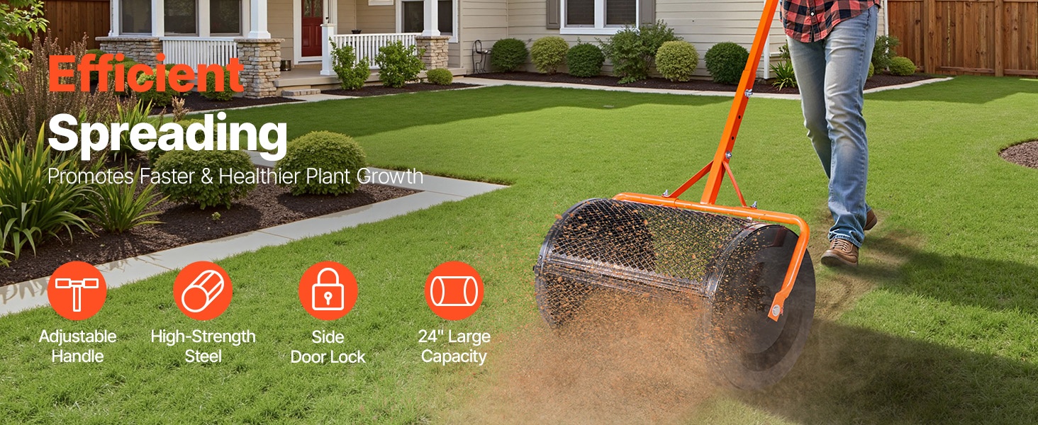 24-tuumainen kompostinlevitin tekee maanparannusaineiden, siementen ja hiekan levittämisestä tasaista ja vaivatonta. Soveltuu nurmikoille, kasvimaalle ja pienille pelloille, kun halutaan tasainen maapinta ja parempi kasvien kasvu.