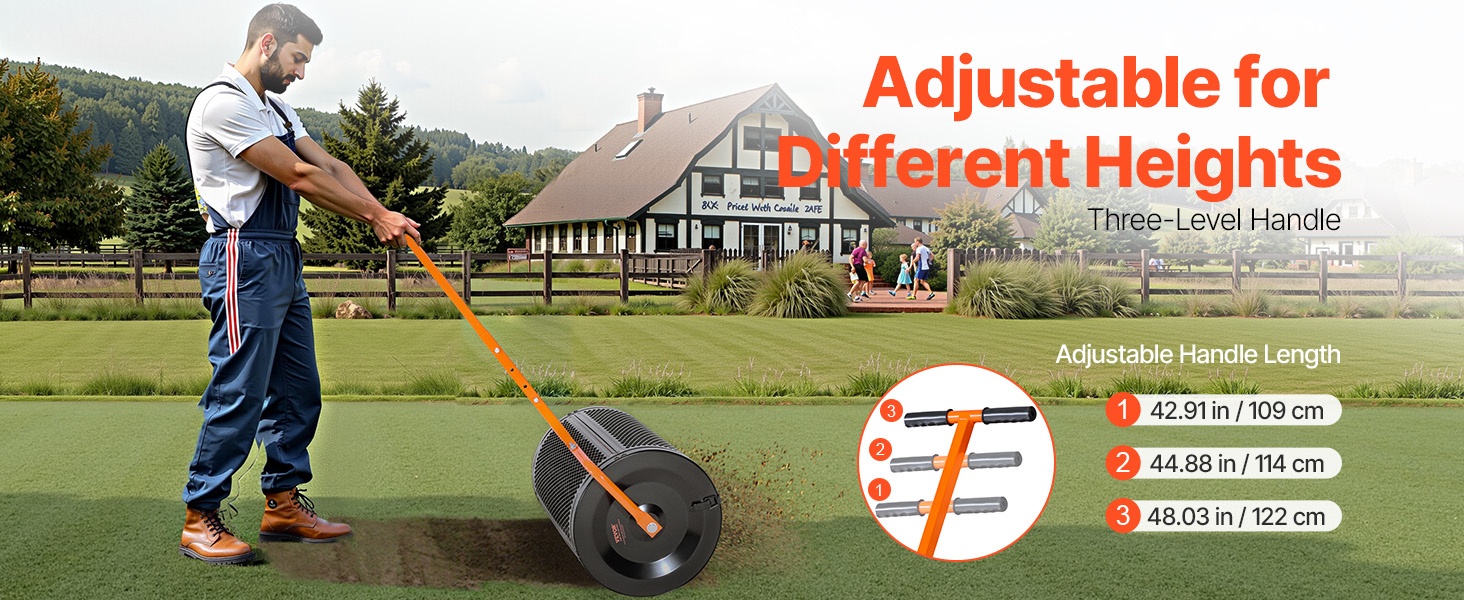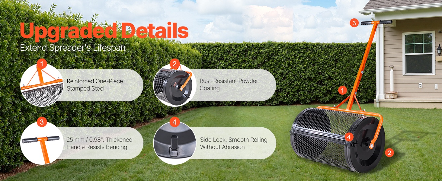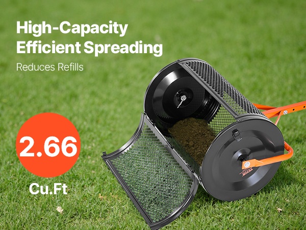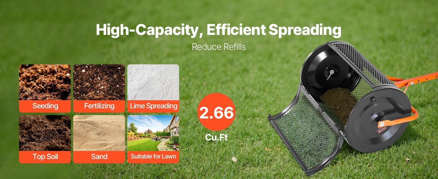 24-tuumainen rumpu vetää jopa 2.66 kuutiojalkaa siemeniä, lannoitetta, kalkkia, pintamultaa tai hiekkaa. Tilava rumpu vähentää täyttökertoja ja parantaa työn tehokkuutta erityisesti suuremmilla nurmikoilla ja puutarha-alueilla.