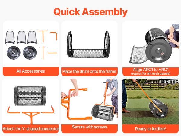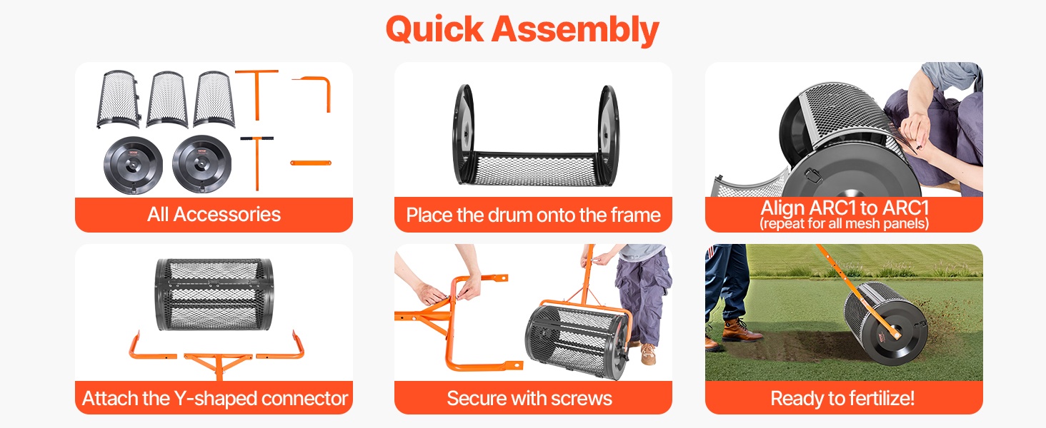 Levittimen kokoaminen käy muutamassa vaiheessa: asenna pyörivä rumpu, kiinnitä verkkorakenne, liitä Y-muotoinen kannatin ja kiristä ruuvit. Tämän jälkeen laite on valmis levittämään ravinteet tasaisesti nurmikolle tai kasvimaalle.