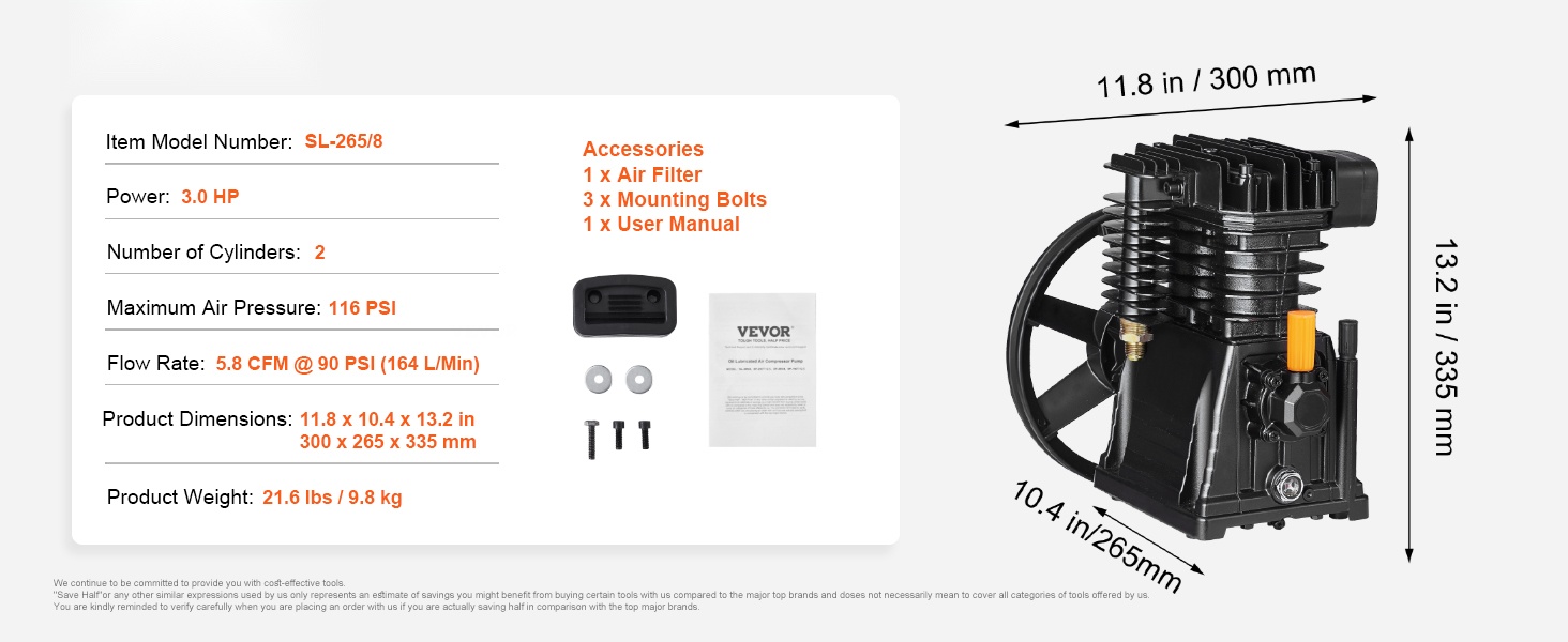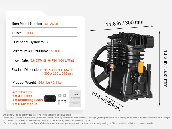 3HP kaksisylinterinen kompressoripää tuottaa ilmavirran 6.25 CFM @ 90 PSI ja maksimikäyttöpaineen 116 PSI. Yksivaiheinen kompressio takaa tasaisen ja riittävän paineilman esimerkiksi työkalujen, puhalluksen ja erilaisten täyttötöiden tarpeisiin.