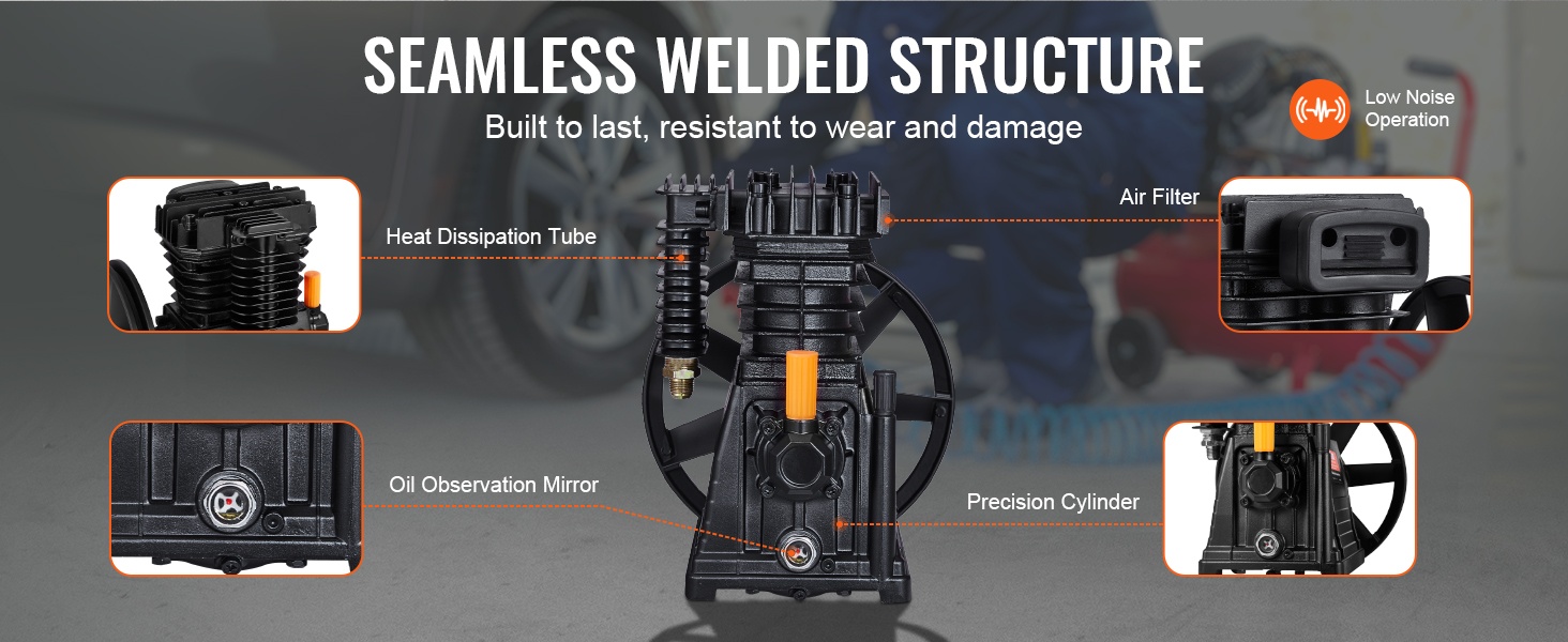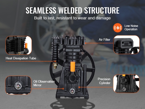 Kompressoripäässä on saumattomasti hitsattu rakenne, joka kestää kulutusta ja pitkäaikaista käyttöä. Integroitu öljyn tarkastusikkuna helpottaa öljymäärän seurantaa, jolloin oikea voitelutaso on helppo varmistaa.