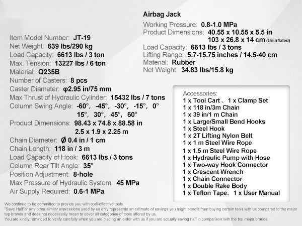 - Malli: JT-19, nettopaino: 34.83 lbs / 15.8 kg