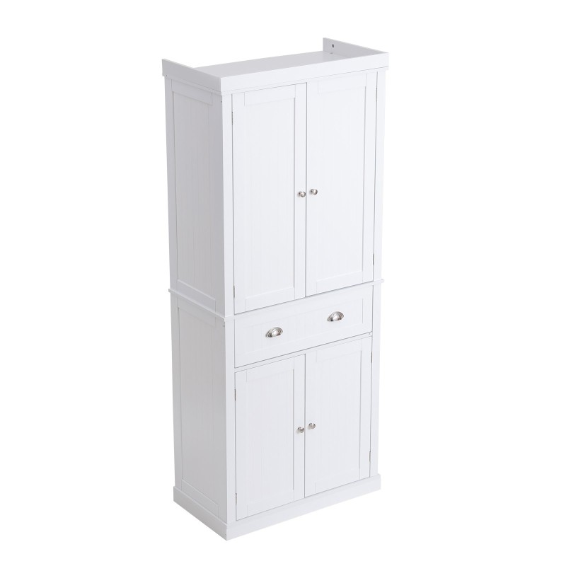 Tämä korkea keittiön kaappimallinen ruokakomero tarjoaa runsaasti säilytystilaa ja auttaa pitämään keittiön, kodinhoitohuoneen tai olohuoneen siistinä. Kaapissa on ovien taakse kätkeytyviä hyllyjä, keskellä laatikko pienille tavaroille sekä helppohoitoinen, maalattu MDF-pintamateriaali.