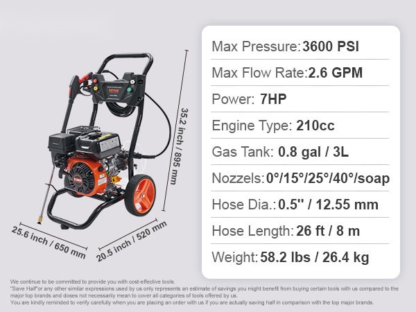 - 50 ft / 15 m korkeapaineletku, letkun halkaisija 0.6'' / 15.62 mm