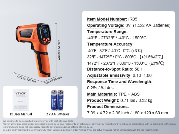 - Lämpötilan tarkkuus: -40°F - 32°F / -40°C - 0°C (±3℃); 32°F - 1472°F / 0°C - 800°C (±1.5% / ±2℃); 1472°F - 2372°F / 800°C - 1500°C (±3%℃)