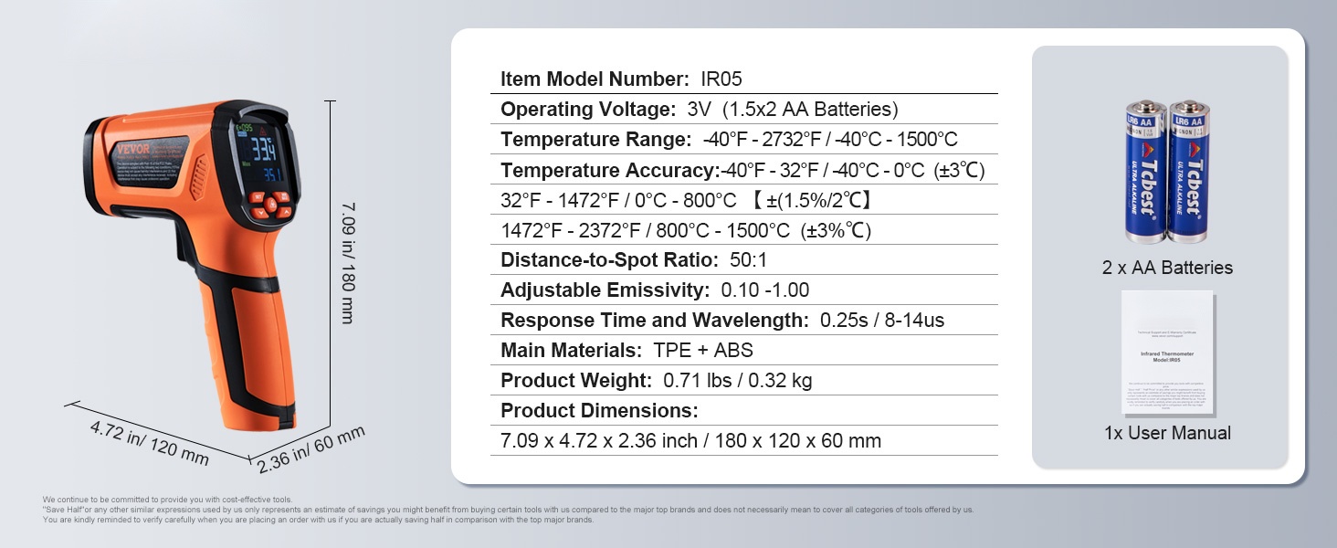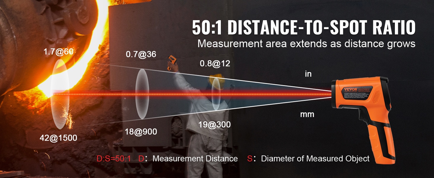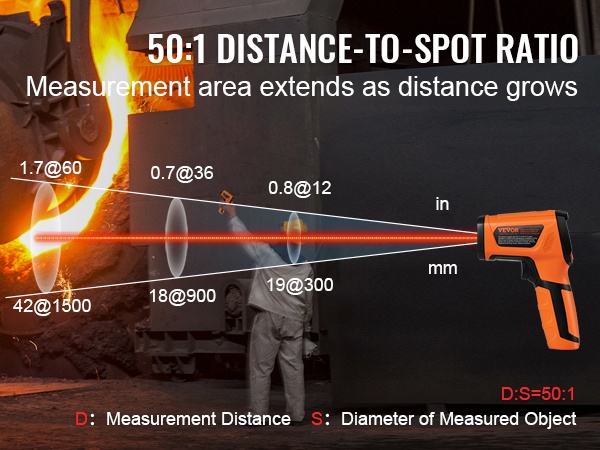 Tässä laserlämpömittarissa on 50:1 etäisyys-piste -suhde, mikä laajentaa mittausalueen käyttöä. Voit mitata korkeita lämpötiloja turvallisesti etäältä ilman, että sinun tarvitsee lähestyä lämmönlähdettä.