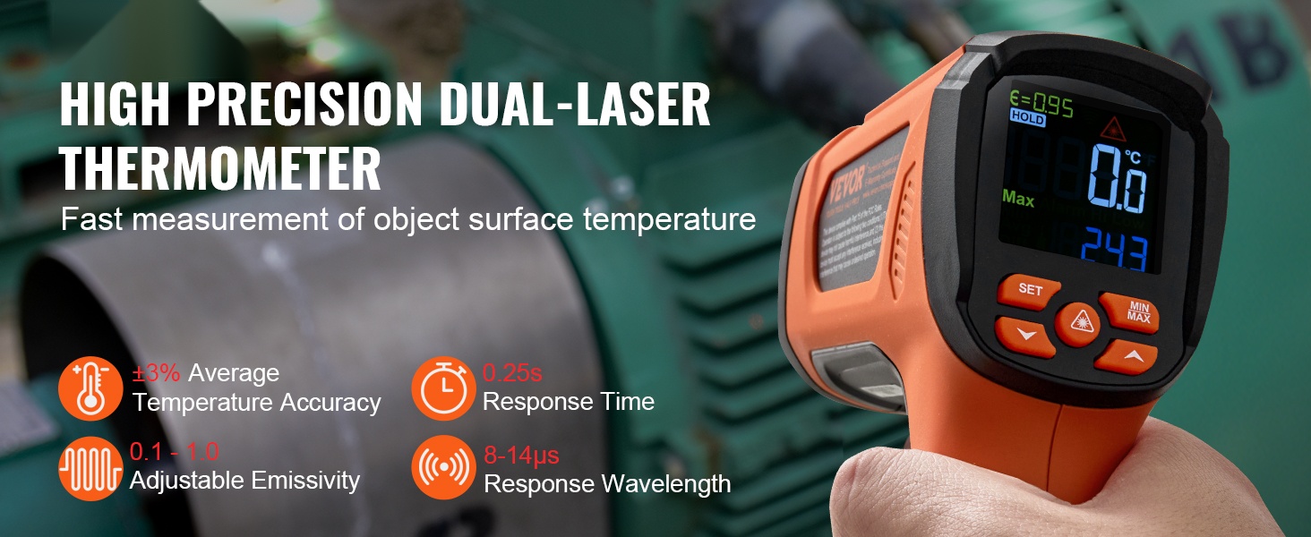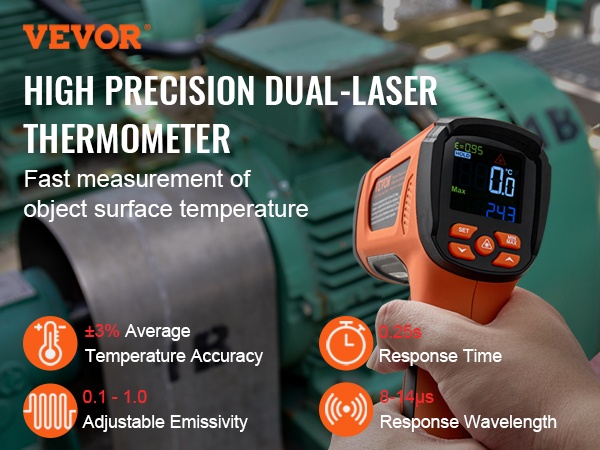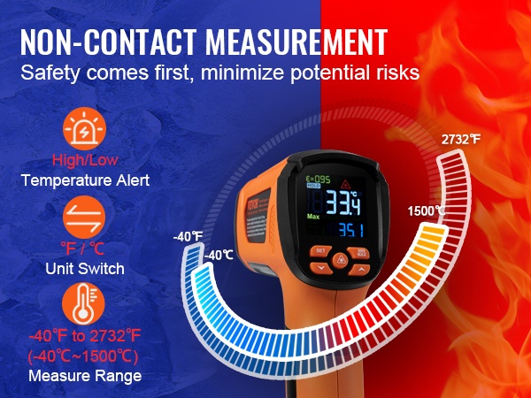 Paranna lämpötilan mittaamista kosketuksettomalla infrapunalämpömittarilla. Kaksisäteinen IR-mittari tarjoaa säädettävän emissiivisyyden 0.10-1.00, nopean vasteajan 0.25s, laajan mittausalueen -40℉ – 2732℉ ja 50:1 etäisyys-piste -suhteen, mikä sopii erityisesti korkeiden lämpötilojen mittaukseen, kuten metallin sulatukseen.