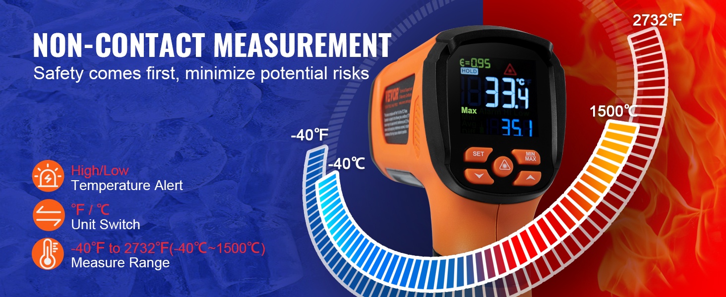 Tämä lämpömittari on turvallinen ratkaisu lämpötilan mittaamiseen. Vältä riskialtista fyysistä kosketusta ja saat silti tarkat lukemat. Lämpötila-alue -40°F – 2732°F tekee siitä käyttökelpoisen monissa korkean lämpötilan tilanteissa, kuten metallin sulatuksessa.