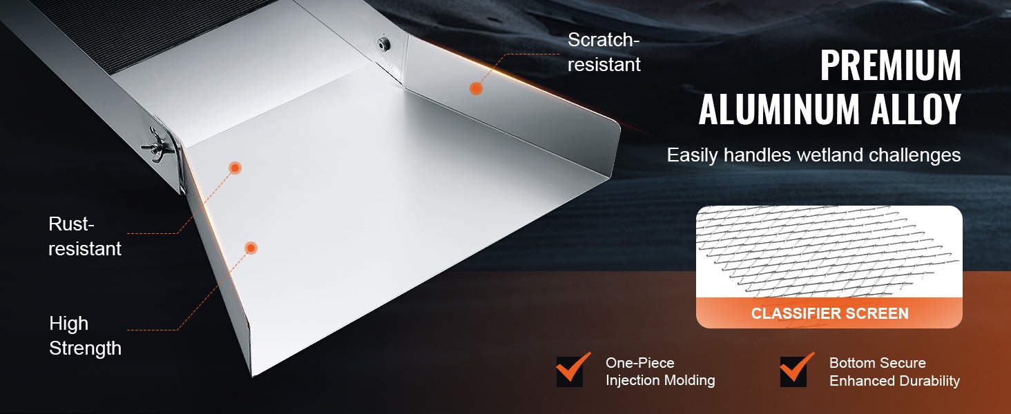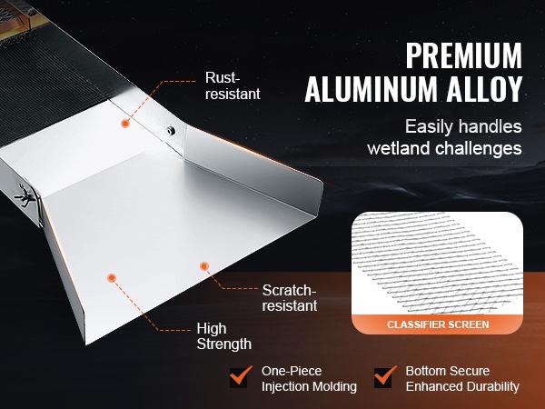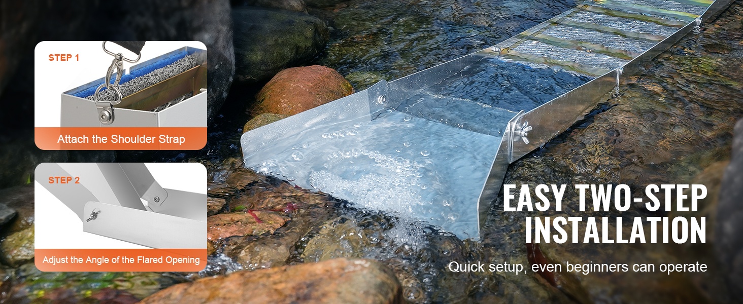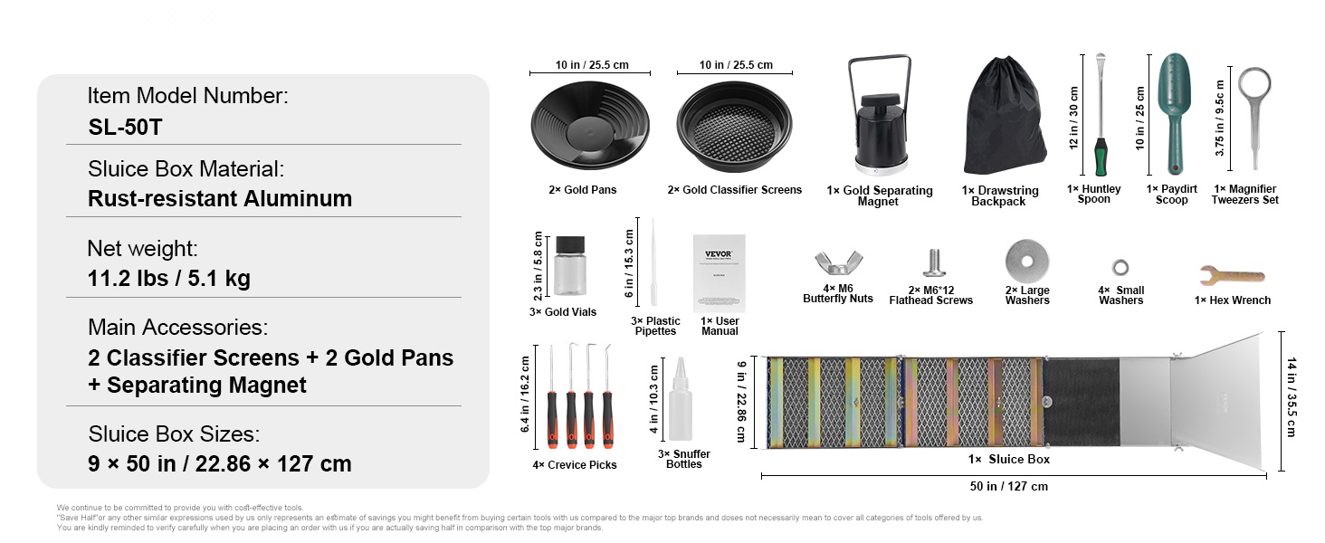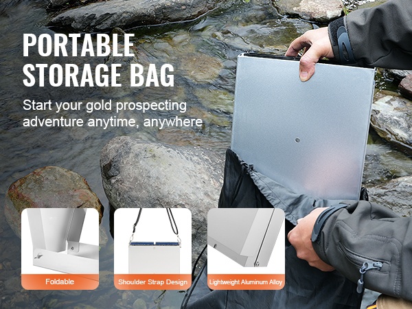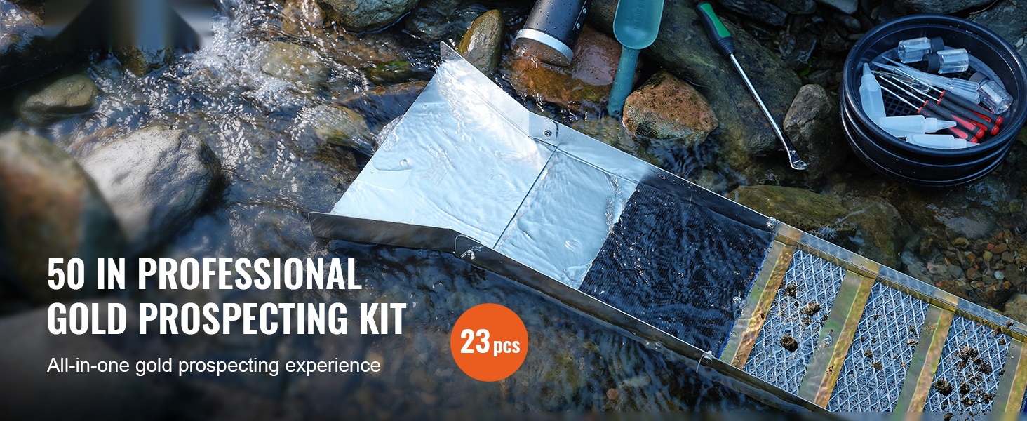 Tässä 23-osaisessa kullanhuuhdontaseteissä on kaikki, mitä tarvitset kullan etsintään: pitkä vesipato (sluice box), seulat, erottelumagneetti, keräyspullot, nyörireppu ja muita käytännöllisiä tarvikkeita. Setti sopii sekä aloittelijoille että kokeneemmille kullanetsijöille.