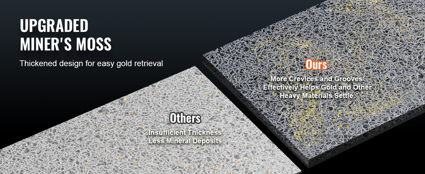 Paksuuntunut miner’s moss -matto sisältää runsaasti uurteita ja koloja, joihin kullanjyvät ja muut raskaammat materiaalit jäävät talteen kevyemmän hiekan ja epäpuhtauksien huuhtoutuessa pois. Tämä tehostaa kullan talteenottoa ja parantaa onnistumisen mahdollisuuksia.