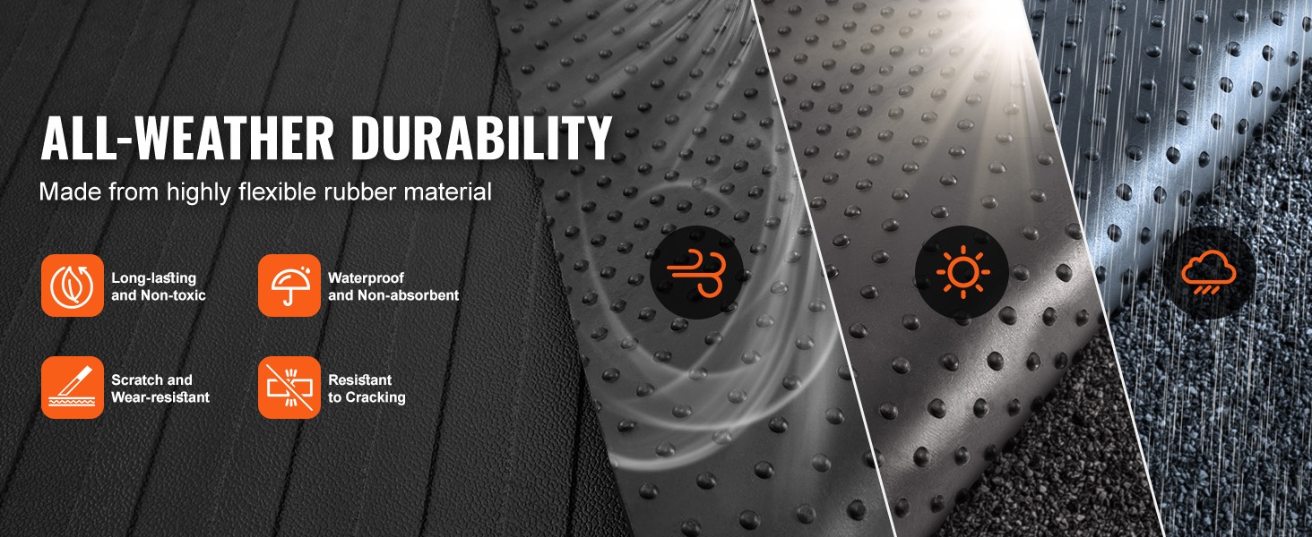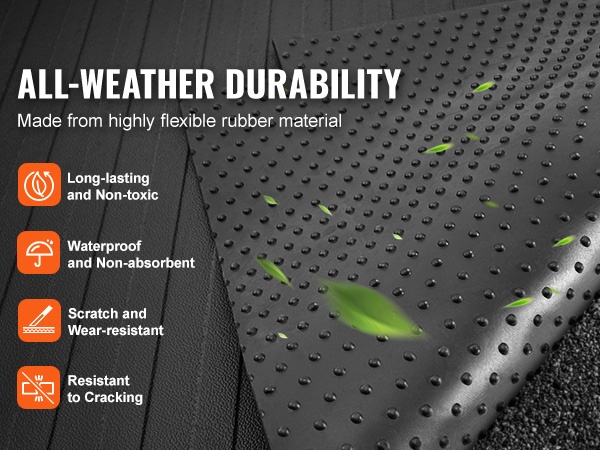 Kumimateriaalin ominaisuuksiin kuuluu vedenpitävyys, naarmunkestävyys ja hyvä vastustuskyky läpäisyä vastaan. Matto kestää auringonpaistetta, sadetta ja vaihtelevia ulkoilmaolosuhteita, mikä tukee pitkäaikaista käyttöä.