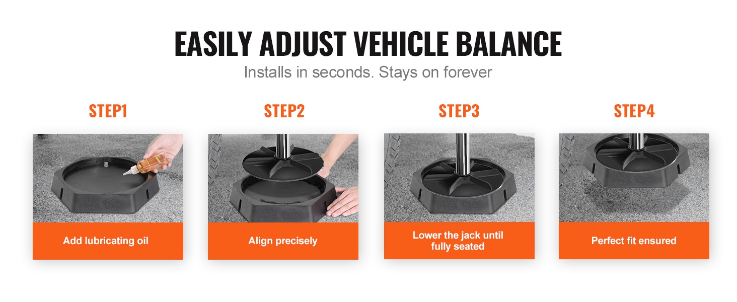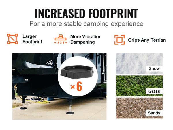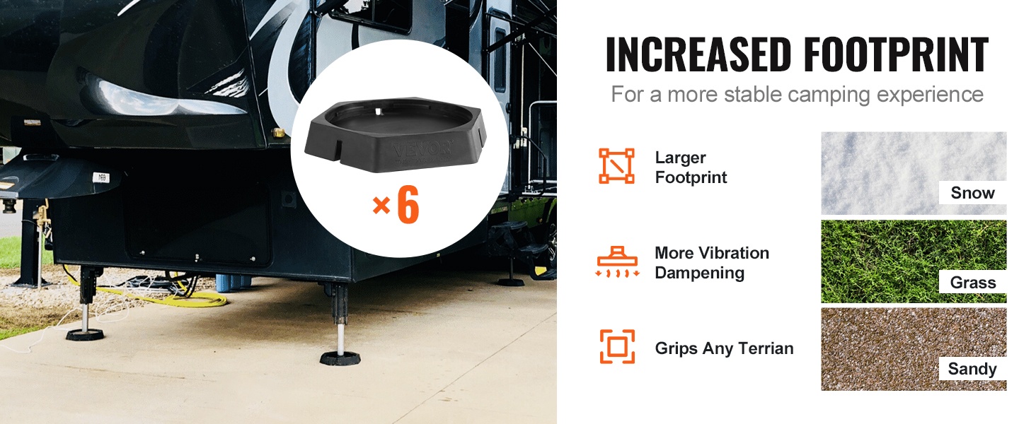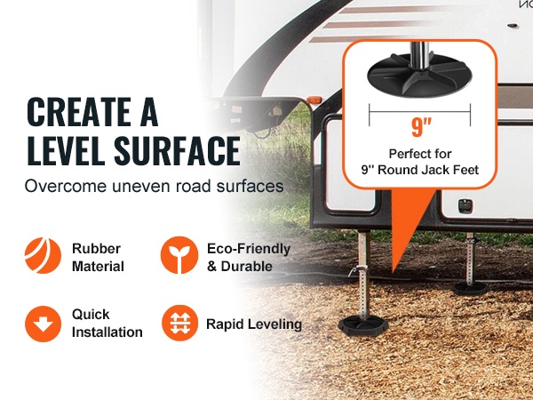 Nämä 9-tuumaisille pyöreille tunkkijaloille sopivat kumityynyt auttavat tasaamaan matkailuauton, asuntovaunun tai 5th wheel -vaunun nopeasti myös epätasaisella alustalla. Tasainen ajoneuvo tekee yöpymisestä miellyttävämpää ja vähentää heilumista.
