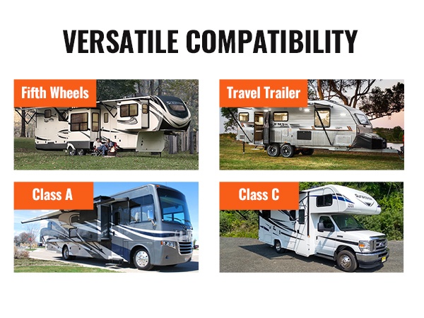 - Sopii matkailuautoihin, asuntovaunuihin, 5th wheel -vaunuihin ja luokan A/C matkailuautoihin