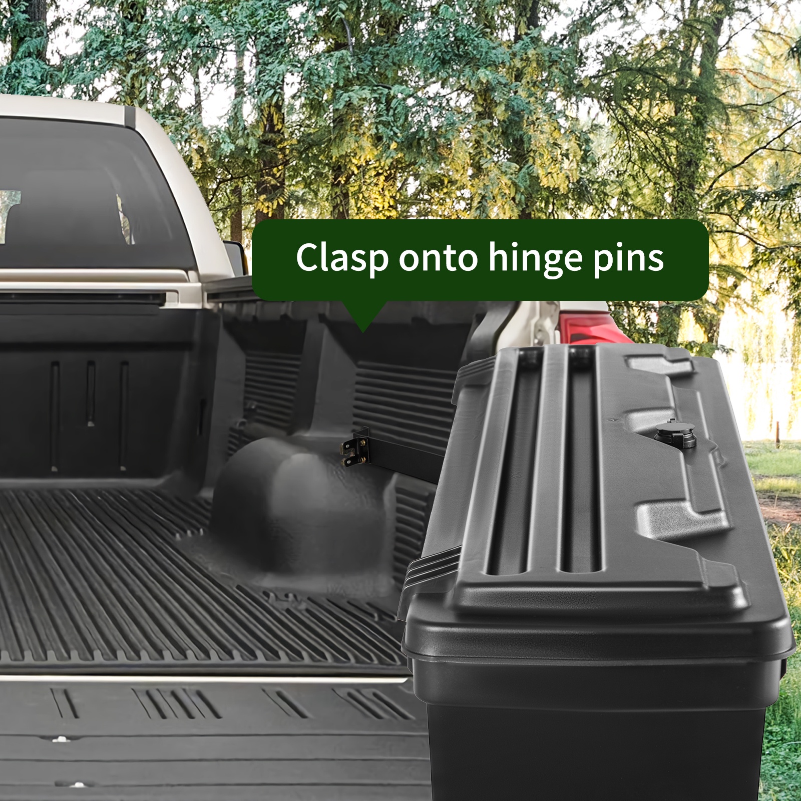 Tilava ja lavan reunaan kiinnitettävä säilytysratkaisu auttaa pitämään työkalut ja tarvikkeet siististi järjestyksessä. Tiivis rakenne suojaa sisältöä sateelta, lumelta ja lialta – ympäri vuoden.