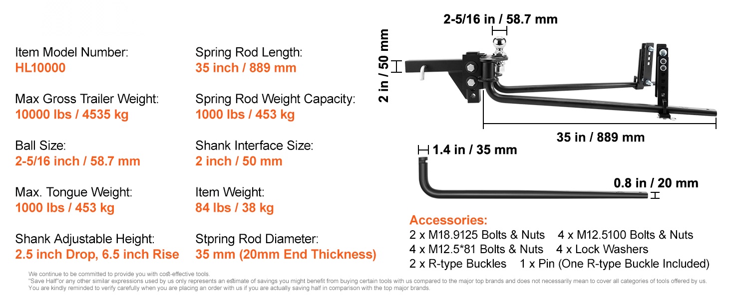 - Vetopalkin säädettävä korkeus: 2.5 inch pudotus, 6.5 inch nosto
