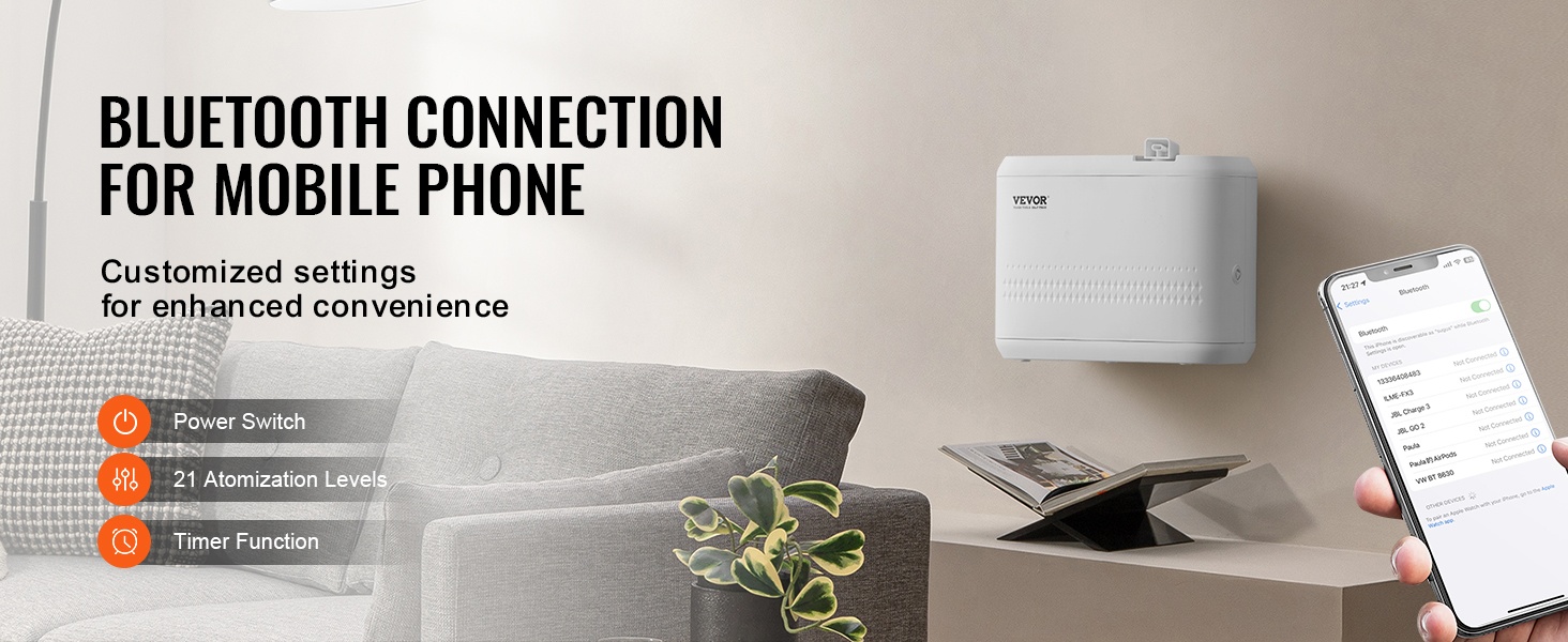 Bluetooth-yhteyden avulla voit räätälöidä tuoksuelämyksen helposti. Voit ohjata virran päälle ja pois, säätää tehotasoja sekä ajastusta suoraan puhelimella, mikä tekee käytöstä vaivatonta arjessa ja ammattilaiskäytössä.