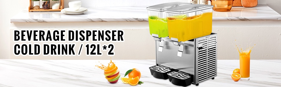 Juoma-annostelijassa on kaksi säiliötä, kumpikin 12L (2.7 UK Gallon), joten laite on kompakti mutta silti riittävän tilava vilkkaaseen käyttöön. Leveämmät sekoittajat takaavat tehokkaan 360° sekoituksen, ja kumiset tiivisterenkaat ehkäisevät vuotoja.