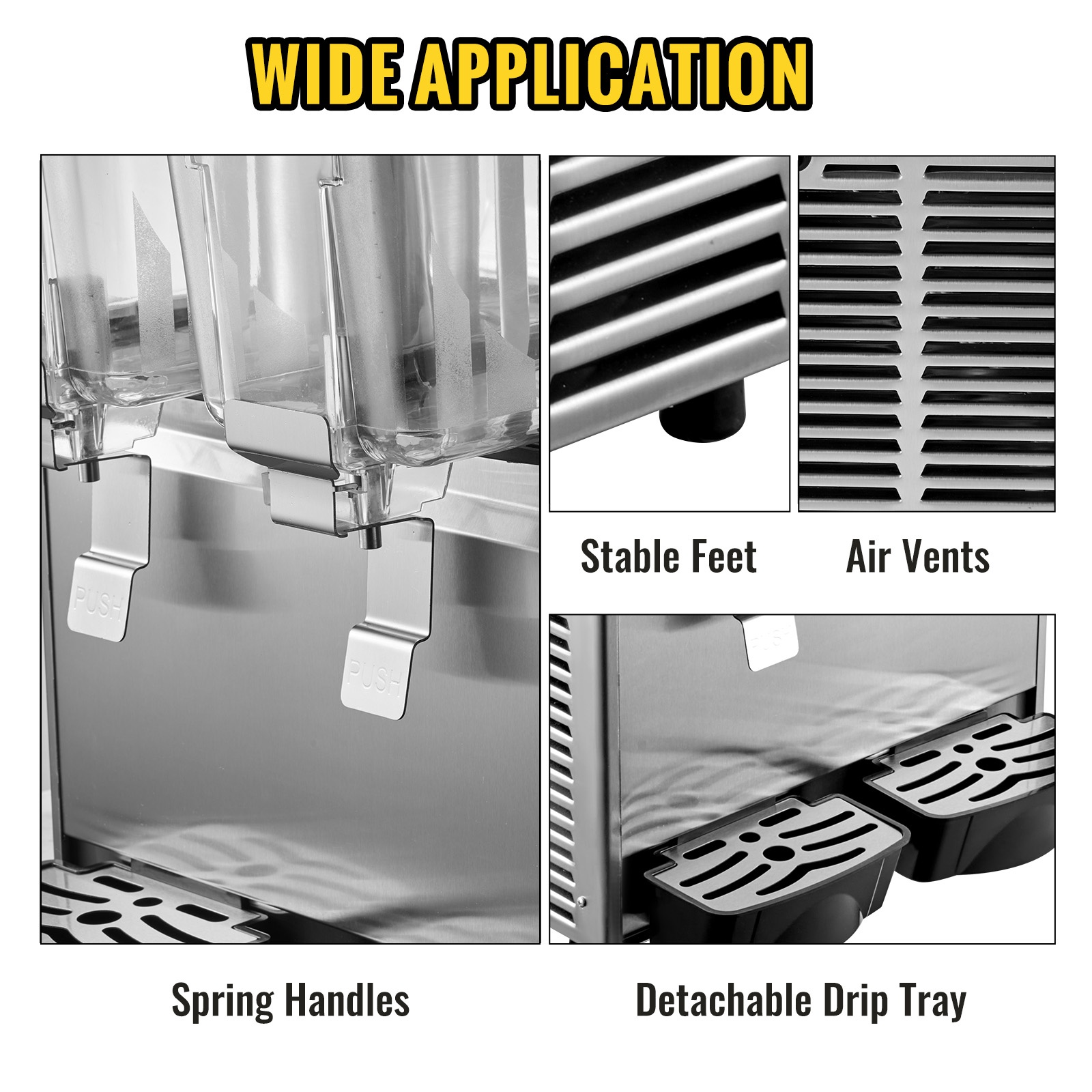 Irrotettava tippakaukalo helpottaa puhdistusta. Jousikuormitteinen juoma-aukko tekee annostelusta kevyttä, ja useat ilmanvaihtoaukot edistävät lämmön haihtumista laitteen sisältä.