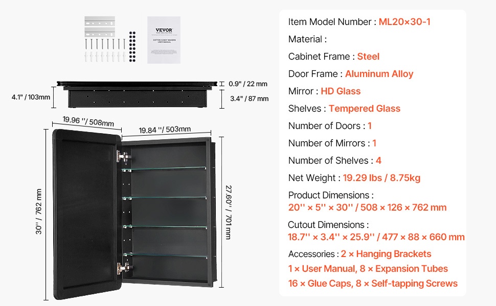 - Tuotteen mitat: 20 x 5 x 30 tuumaa / 508 x 126 x 762 mm