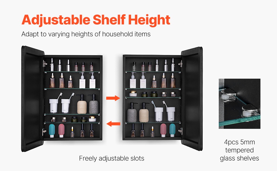 Kylpyhuoneen lääkekaappi peiliovella teräsrunko neljä säädettävää karkaistua lasihyllyä käännettävä ovi