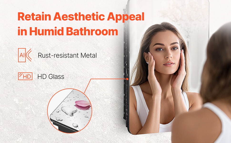 Kaappi on valmistettu korroosionkestävästä alumiinista, joka kestää kylpyhuoneen kosteutta, pesuaineita ja päivittäistä käyttöä. Karkaistusta lasista valmistetut hyllyt ovat tukevat ja turvalliset, ja ne on helppo pitää puhtaana.